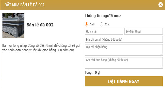 BƯỚC 2: Khách hàng Click vào sản phẩm quan tâm muốn mua, Sau đó clik vào mua ngay màn hình sẽ hiểu thị ra bảng thông tin. Khách hàng sẽ điền thông tin bắt buộc như họ tên, số điện thoại, địa chỉ nhận hàng.